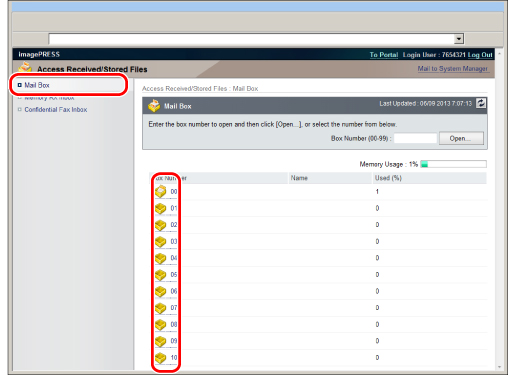 Click [Access Received/Stored Files] → select [Mail Box] → click the number of the desired mail box.