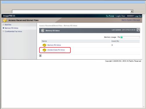 Click [Access Received/Stored Files] → [Memory RX Inbox] → [Divided Data RX Inbox].
