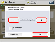 Se ajustar a densidade do fundo carregando em [Ajustar] para <Densidade do fundo>, a programação [Auto] é cancelada. De igual modo, se carregar em [Auto] enquanto estiver a fazer ajustes manuais em [Ajustar], a máquina cancela os ajustes. A máquina ajusta automaticamente a densidade de acordo com o fundo.