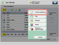 O primeiro caráter que introduzir para o nome é utilizado para ordenar a lista de destinos quando carregar em teclas como, por exemplo, [ABC], [DEF] e [GHI] no ecrã Livro de endereços. Se carregar em [Procurar por nome] no ecrã Livro de endereços, aparece um ecrã que permite restringir a procura no livro de endereços.