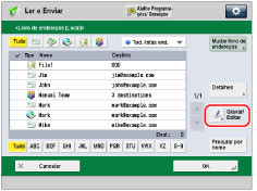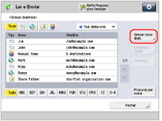 O primeiro caráter que introduzir para o nome é utilizado para ordenar a lista de destinos quando carregar em teclas como, por exemplo, [ABC], [DEF] e [GHI] no ecrã Livro de endereços. Se carregar em [Procurar por nome] no ecrã Livro de endereços, aparece um ecrã que permite restringir a procura no livro de endereços.