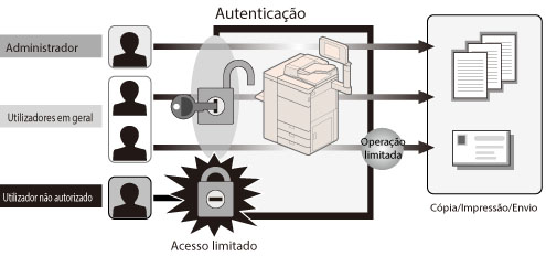 Para aceder a esta máquina, é necessária uma autenticação com introdução de informações de utilizador (nome de utilizador e password), informações essas que são verificadas pela máquina. A máquina só pode ser usada por um utilizador autorizado que passe a fase de autenticação com sucesso. Pode impedir o acesso por utilizadores não autorizados, fazendo a gestão dos utilizadores da máquina. Para utilizar o modo de autenticação, tem primeiro de gravar as informações relativas a administradores e utilizadores em geral.