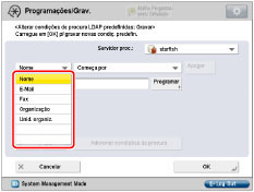 Se gravar as condições de procura mais utilizadas para procurar destinos no servidor LDAP, as condições de procura gravadas aparecem no ecrã de procura como pré-programação.