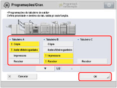 A ordem de prioridade dos destinos de saída é determinada pela ordem dos tabuleiros de saída selecionados. A prioridade é apresentada como "1" e "2".
