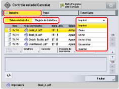 Carregue em [Trabalho] → [Estado trabalho] ou [Registo de trabalhos] → selecione o tipo de trabalho na lista pendente.