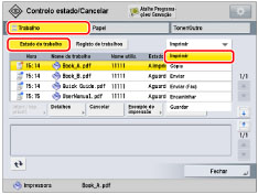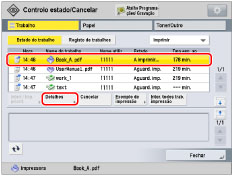 Se selecionar um trabalho de impressão e carregar em [Detalhes], carregue em [Alimentação de papel] para forçar a impressão dos dados restantes na memória e carregue em [Continuação automática] para desativar os erros temporariamente e continuar a imprimir. Só pode utilizar Alimentação de papel] e [Continuação automática] para trabalhos de impressão enviados do computador.