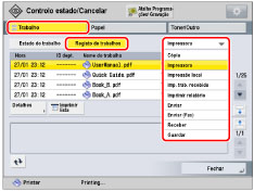 Pode imprimir listas de estado dos trabalhos de impressão para trabalhos Enviar/Enviar (Fax), além de listas de registos de trabalhos. Para imprimir listas de estado de trabalhos, selecione [Enviar] ou [Enviar (Fax)] na lista pendente → carregue em [Imprimir lista].