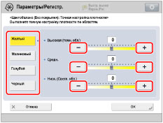 Выберите цвет, который требуется настроить, → клавишей [-] или [+] настройте уровень плотности для темных (высокая), средних и светлых (низкая) областей плотности.