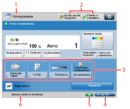 Здесь отображаются процесс выполнения заданий и операций копирования, а также состояние устройств и расходных материалов. В зависимости от того, какой службой аутентификации вы пользуетесь, здесь может отображаться идентификатор отдела или имя пользователя.