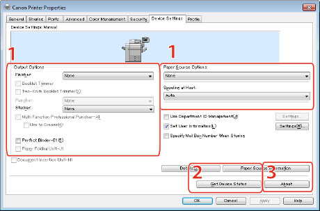 You can obtain device information and update the settings displayed in the sheet (see "Setting the Printer Options").