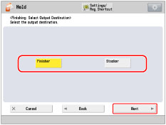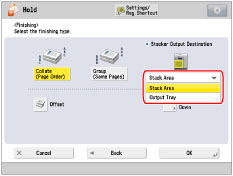 If you select [Stacker], you can change the output destination for each job to either [Stack Area] or [Output Tray].