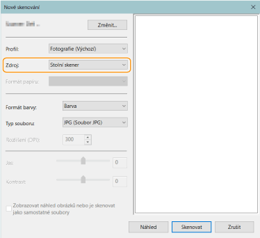 Výběrem typu originálu z rozevíracího seznamu [Profil] můžete nastavit optimální kvalitu obrazu. Pro originály obsahující především text vyberte [Dokument]. Pro originály obsahující pouze fotografie vyberte [Fotografie (Výchozí)].