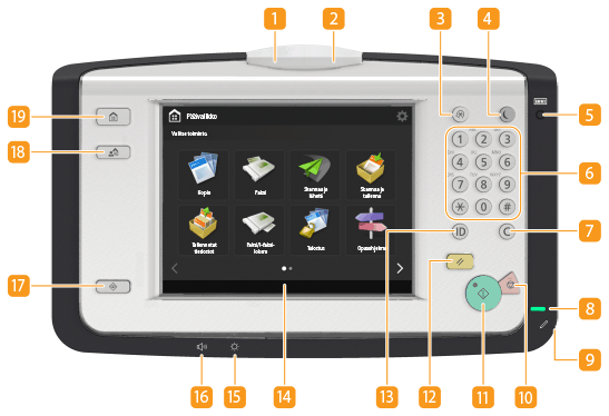 Tätä painamalla voit tarkistaa tulostuksen tai faksauksen tilan tai näyttää laitteen käyttöhistorian. Voit myös tarkistaa laitteen tilan, kuten jäljellä olevat paperin ja väriaineen määrät ja mahdollisesti tapahtuneet virheet.