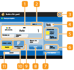 Apresenta o estado das programações como o formato do papel onde pretende imprimir e o número de impressões. Não se esqueça de confirmar as programações para uma impressão correta. Para alterar as programações, carregue no botão sob a secção de apresentação. Para alterar o número de impressões, introduza o número pretendido utilizando as teclas numéricas.