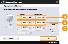 На экране <Корр. искажен. (Трапеция)> введите «250,0» для <c> как для лицевой, так и для обратной стороны.
