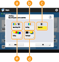 Du kan välja färgläge för kopiering. Till exempel låter dig detta spara toner genom att kopiera färgoriginal i svartvitt, eller kopiera biljetter med en enda färg som rött eller blått för att visa på vilket datum de gavs ut.