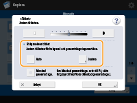 När skärmen för att välja originalets format visasOm <Välj papper> är inställt på <Auto> kanske skärmen för att välja originalets format visas. Den visas eftersom originalets format inte kan verifieras och papper inte kan väljas automatiskt när original av hög transparens, original med extremt mörk bakgrundsfärg eller liten storlek har placerats. Välj originalets format eller ett så bra överensstämmande format som möjligt.