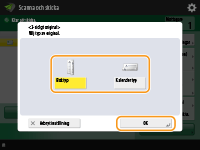 <Övre kant mot bortre kant> <Orig. innehållsriktning> <OK>.Om du placerar stora original i till exempel A3-format, tryck på <Alternativ> på skärmbilden för grundläggande scanningsfunktioner
