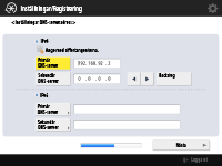 Tryck på <Primär DNS-server> och <Sekundär DNS-server>, ange IPv4-/IPv6-adressen för DNS-servern och tryck på <Nästa>.