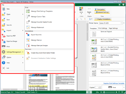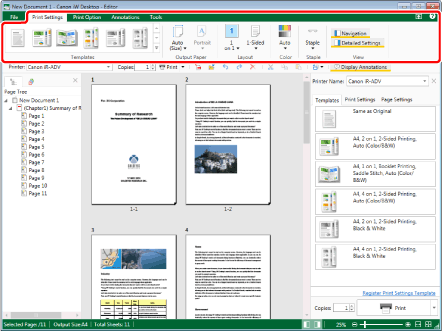 The ribbon includes tabs of commands for performing operations such as configuring the print settings, adding annotations or digital stamps, and calling the Mail Merge Print Settings Mode/various edit modes.