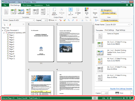 The status bar displays the total number of document pages, page number of the currently selected page, output paper sizes, and the number of sheets to be printed. It also enables you to perform the following operations.