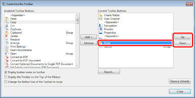 If [Add] is clicked after selecting a button in [Current Toolbar Buttons], the button selected in [Available Toolbar Buttons] is added below the selected button.