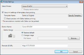 When the [Use print settings of template when printing] check box is selected, a template mark will be added to the printer output button.