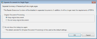 From now on, the [Separate Document into Single Pages] dialog box is not displayed. The processing mode selected in [Original Document Processing] will be applied to the original document.