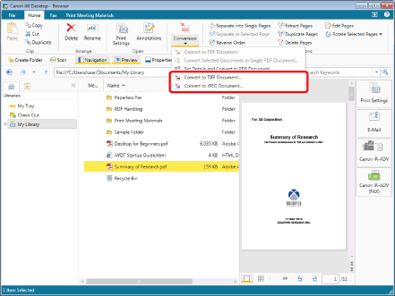 (Conversion) on the ribbon, and select [Convert to TIFF Document] or [Convert to JPEG Document].