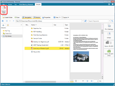 The same operation can also be performed from the Edit Pages Mode screen to export the selected page. For information on the Edit Pages Mode, see the following.