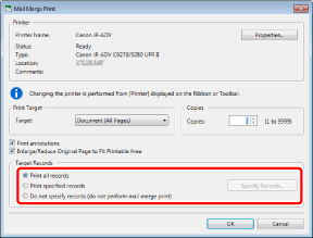 When printing a document with Mail Merge fields set, [Print] automatically switches to [Mail Merge Print]. To execute Mail Merge printing, perform one of the following operations.