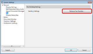 [System Settings] > [Browser] > [Fax] > [Retrieve Fax Number]
