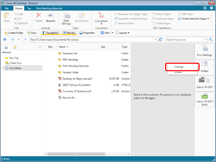 You can also perform the same operation by clicking for the mail output button displayed on the ribbon or toolbar and selecting [Change]. If an output button is not displayed on the ribbon or toolbar, see the following to display one.