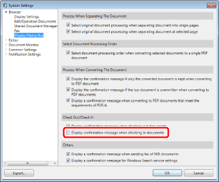 [System Settings] > [Browser] > [Display Dialog Box] > [Display confirmation message when checking in documents]