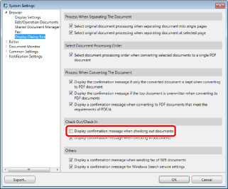 [System Settings] > [Browser] > [Display Dialog Box] > [Display confirmation message when checking out documents]