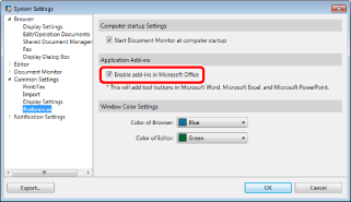 Select the [Enable add-ins in Microsoft Office] check box in [System Settings] > [Common Settings] > [Preferences], and click [OK].