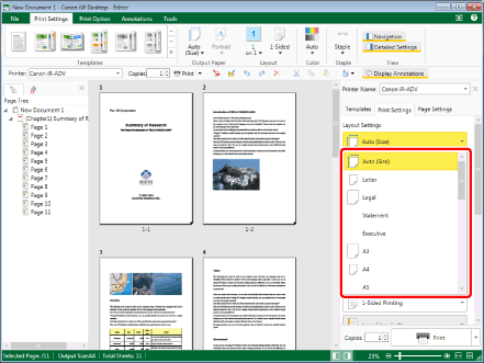 If you set the output paper size to something other than [Auto (Size)] for a document including different page orientations or sizes, pages of which the orientation/size is different from the orientation/size of the current paper are automatically enlarged or reduced to fit the paper width (they are not automatically rotated).