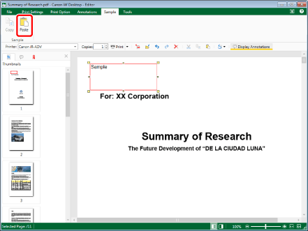 When the next page is specified as the paste destination, the annotation is pasted in the same position as the copy or cut source.