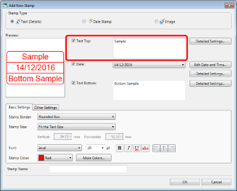 If you do not enter a name in [Stamp Name], a name is automatically set from the text entered in [Text Top]/[Text Bottom].