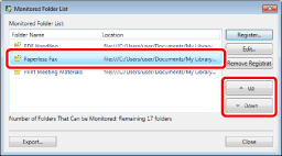 You can set up to 20 folders as monitoring targets. The transfer source folders set in My Tray or a Hot Folder here are not included in the upper limit on the number of folders to monitor.