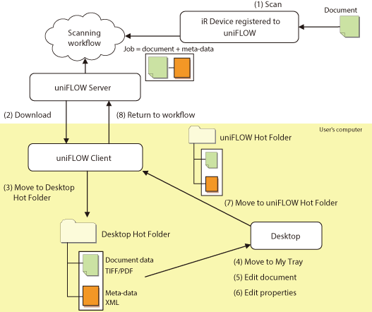 By integrating Desktop and uniFLOW, the documents scanned by the iR devices managed by uniFLOW and their properties can be edited on Desktop.