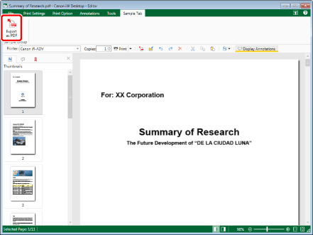 When exporting in the PDF format, the layout settings and the blank side of a 2-sided printing/booklet printing configured in Desktop Editor (such as [Output Size], [Output Paper Orientation], [Page Layout], and [Enlarge/Reduce Original Page]) are applied to the PDF document. If the following are set to be printed, they are also reflected in the PDF document.
