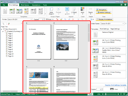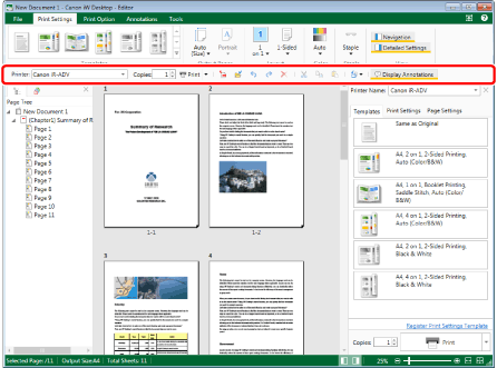 The ribbon includes tabs of commands for performing operations such as configuring the print settings, adding annotations or digital stamps, and calling the Mail Merge Print Settings Mode/various edit modes.