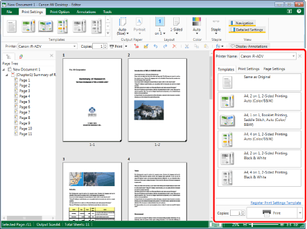 The status bar displays the total number of document pages, page number of the currently selected page, output paper sizes, and the number of sheets to be printed. It also enables you to perform the following operations.
