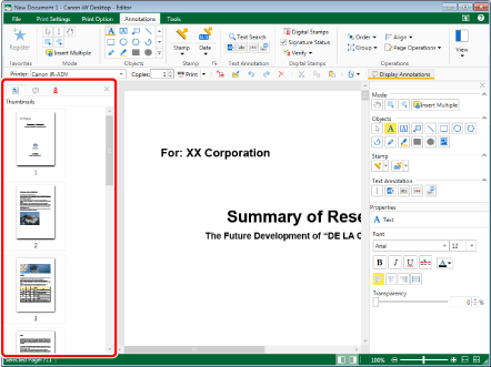 [Thumbnails] tab: Displays the document page thumbnails. Clicking page thumbnails enables you to select pages to be displayed or edited.