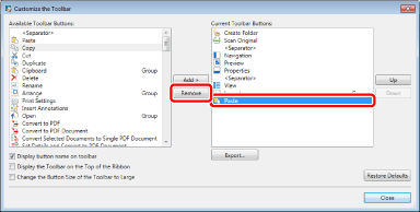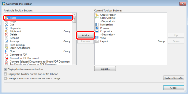 If [Add] is clicked after selecting a button in [Current Toolbar Buttons], the button selected in [Available Toolbar Buttons] is added below the selected button.