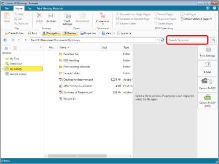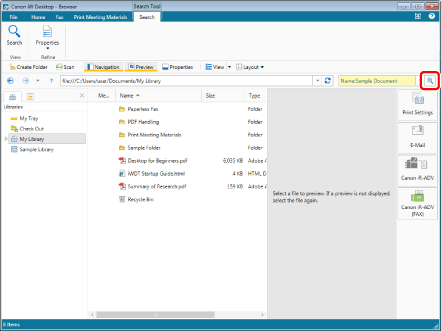 The path of the search target library or folder is displayed in [Search Location] on the Search Screen.