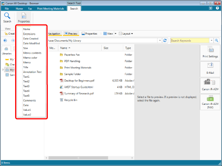 (Properties) on the ribbon displays the types of properties that can be searched for in the selected library.For details on the properties, see the following.