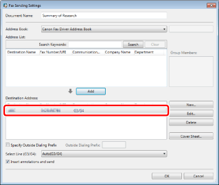 If the fax driver to use supports something other than G3/G4, the fax number is displayed in [Destination Name], and [Fax Type] and [Communication Mode] become blank. After selecting the address in [Destination Address], click [Edit] to correct it.