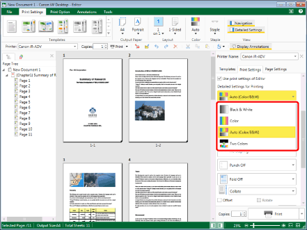 If you deselect the [Apply the color setting to preview] check box on the [Print Settings] tab on the Details Window, the ribbon command, or the tool button, the preview is displayed in color even if you set the color mode to [Black & White].